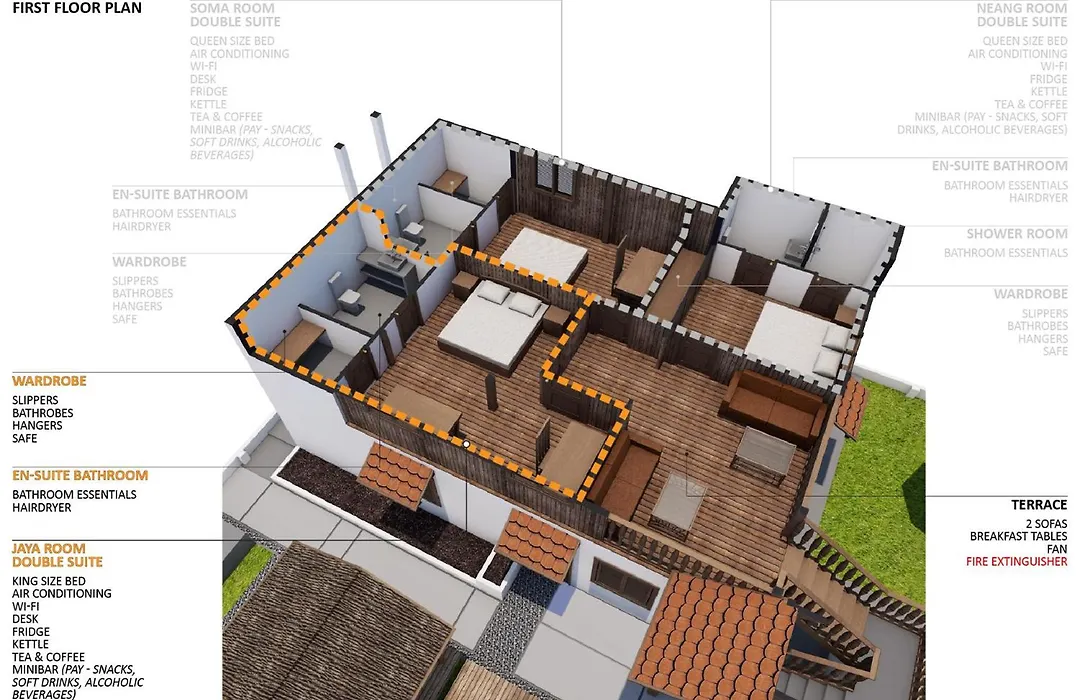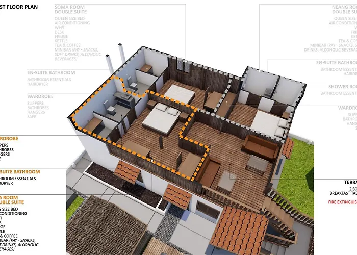 5のベッドルームのWat Bo Houseヴィラは、広さ500㎡の12名用の宿泊施設で、庭園の景色を望めます。 キチネットと5のバスルームがあります。