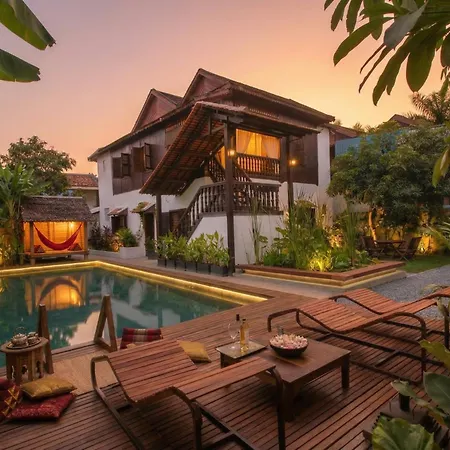 プールの景色を見渡せるテラスを提供する客室6室のシェムリアップ Wat Bo Houseヴィラは、Wat Bo Templeから歩いて5分離れた場所にあります。